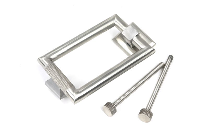 Stud: 35mm x 20mm x 19mm The Brompton suite is our most contemporary design to date, and features a textured knurled pattern. The industrial styling of the diamond effect creates a modern range of products that can be used throughout your property. The Brompton suite is our most contemporary design to date, and features a textured knurled pattern. The industrial styling of the diamond effect creates a modern range of products that can be used throughout your property. Our Brompton range is forged from marine ss (316) which emphasises the high quality materials and manufacturing techniques used. A perfect design choice for external doors with matching products available. Coordinate with our matching Brompton centre door knobs for a truly grand entrance. Fixes to your door using a bolt-through fixing for the knocker and strike plate which is fitted with a matching knurled bolt head on the internal side of the door. Supplied with matching 110mm stainless steel threaded bolts which provide a bolt-through fixing. Our Satin Marine Stainless Steel is grade 316 and manufactured with high concentrations of chromium and nickel. These products offer great strength and have extremely resilient corrosion resistant properties which make them an excellent choice for coastal locations. This finish is low sheen and offers a frosted, matt look. For complementary products, we recommend our Satin Chrome finish.