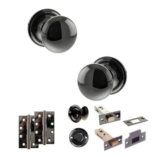 Bathroom Set: Designed for toilet or bathroom doors, it includes a pair of knobs, latch and deadbolt, turn & release and hinges.