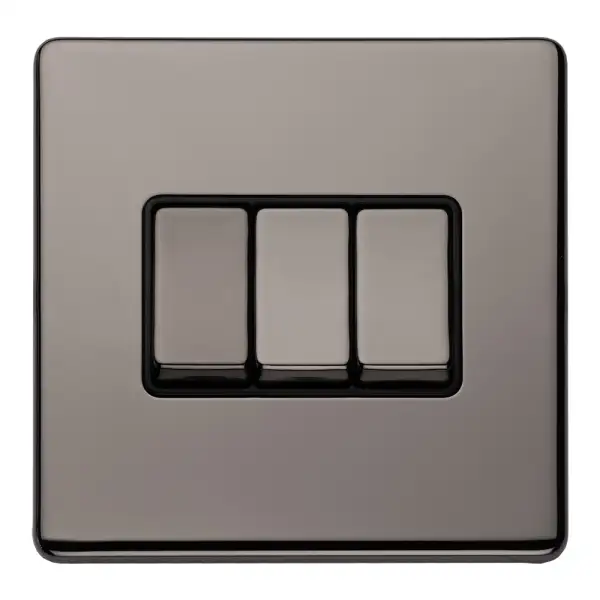 Click Here To Enlarge This Photo Of ECBN3SWB - Eurolite 3 Gang 10Amp 2Way Switch on 3mm Flat Concealed Black Nickel Plate with Matching Rockers
