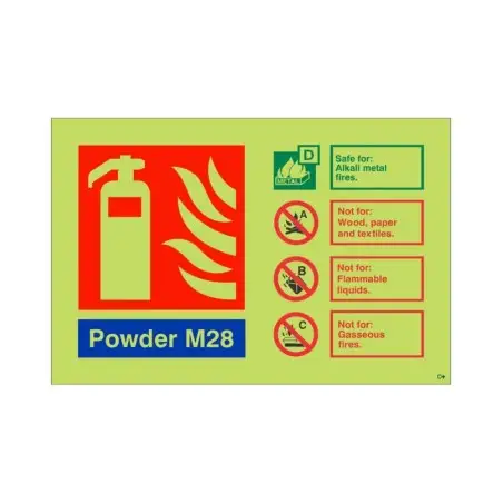 A M28 Fire Extinguisher ID Sign marks the location of M28 extinguishers, designed for effective suppression of specific fire hazards, ensuring quick access during emergencies.