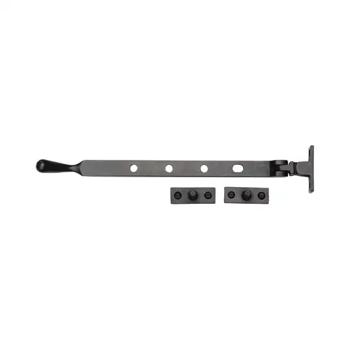Rustic Dark Bronze Casement Stay 10" Our Dark Bronze patinas is hand applied on the metal to create a naturally aged appearance. Dark bronze is a living finish and will lighten where touched frequently. Built for longevity with corrosion resistance, ideal for both interior and exterior applications