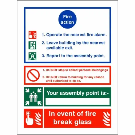 The sign will help you keep your premises safe and ready for fire emergencies with clear instruction for the staff and visitors. Fire action signs outline actions that must be carried out and emergency procedures in the event of fire. All our fire action signs are designed to comply with the UKEC legislation.