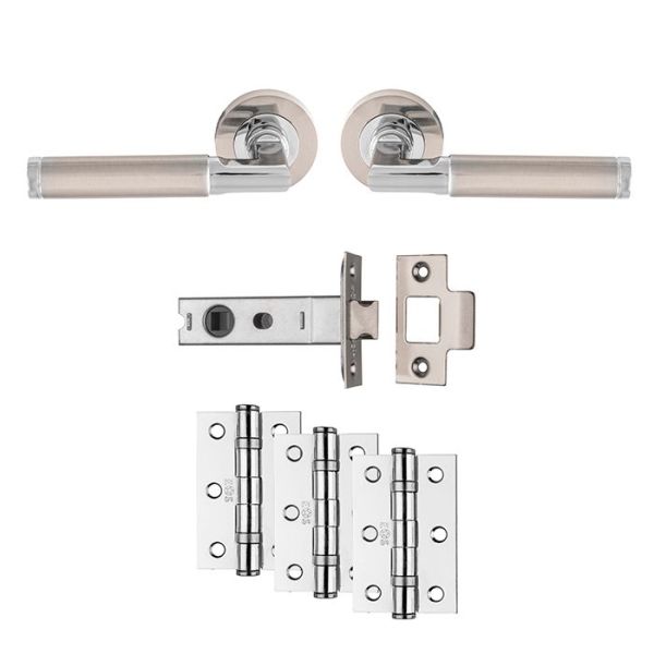 Pack includes a pair of handles, a bolt through 76mm tubular latch and pair and half of hinges. Belas lever on concealed fix screw on rose. Round bar lever with the split finish emphasizing the different sections.