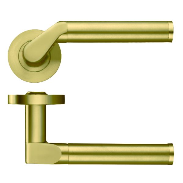 ZPZ120-FSB - Zoo Hardware Stanza 'Venus' Lever Handles on Round Screw on Rose - Favo Satin Brass (Designer Range)